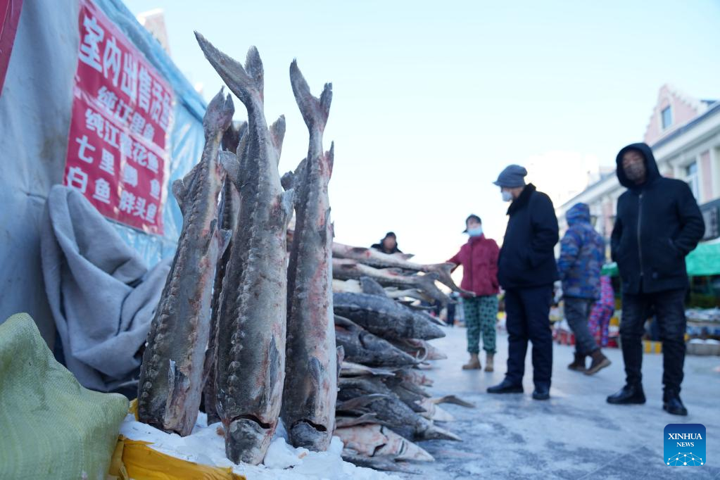 Fish products are displayed at Dongji fish market in Fuyuan City, northeast China's Heilongjiang Province, Jan. 9, 2023. (Xinhua/Wang Jianwei)