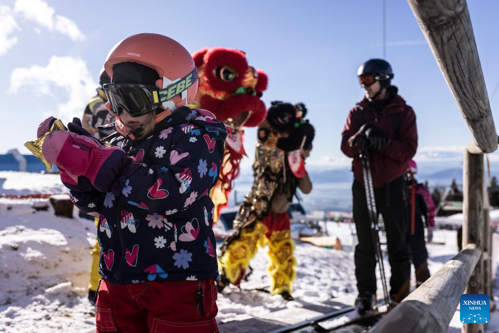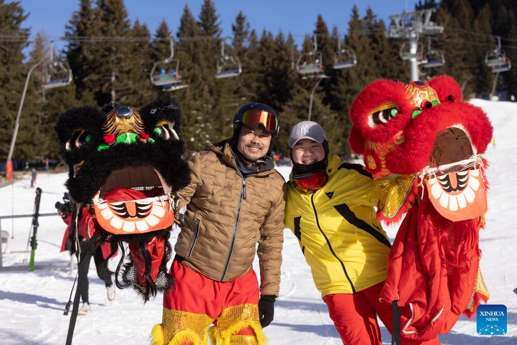 LJUBLJANA, Jan. 14 (Xinhua) -- The sky was clear and the snow was boundless. A big black "lion", galloping on a snowboard and followed by a smaller red "lion", shuttled among skiers, all the way down the Slovenian Alps.