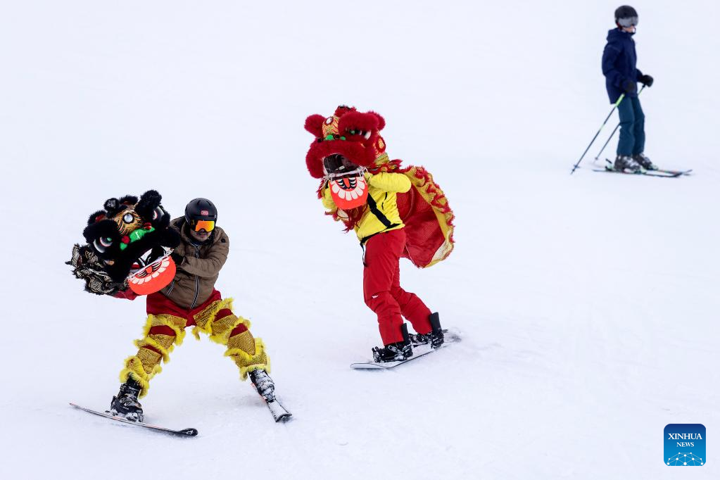 A skier performs lion dance at the Krvavec Ski Resort in Slovenia to celebrate the Spring Festival, on Jan. 14, 2023.(Photo by Zeljko Stevanic/Xinhua)