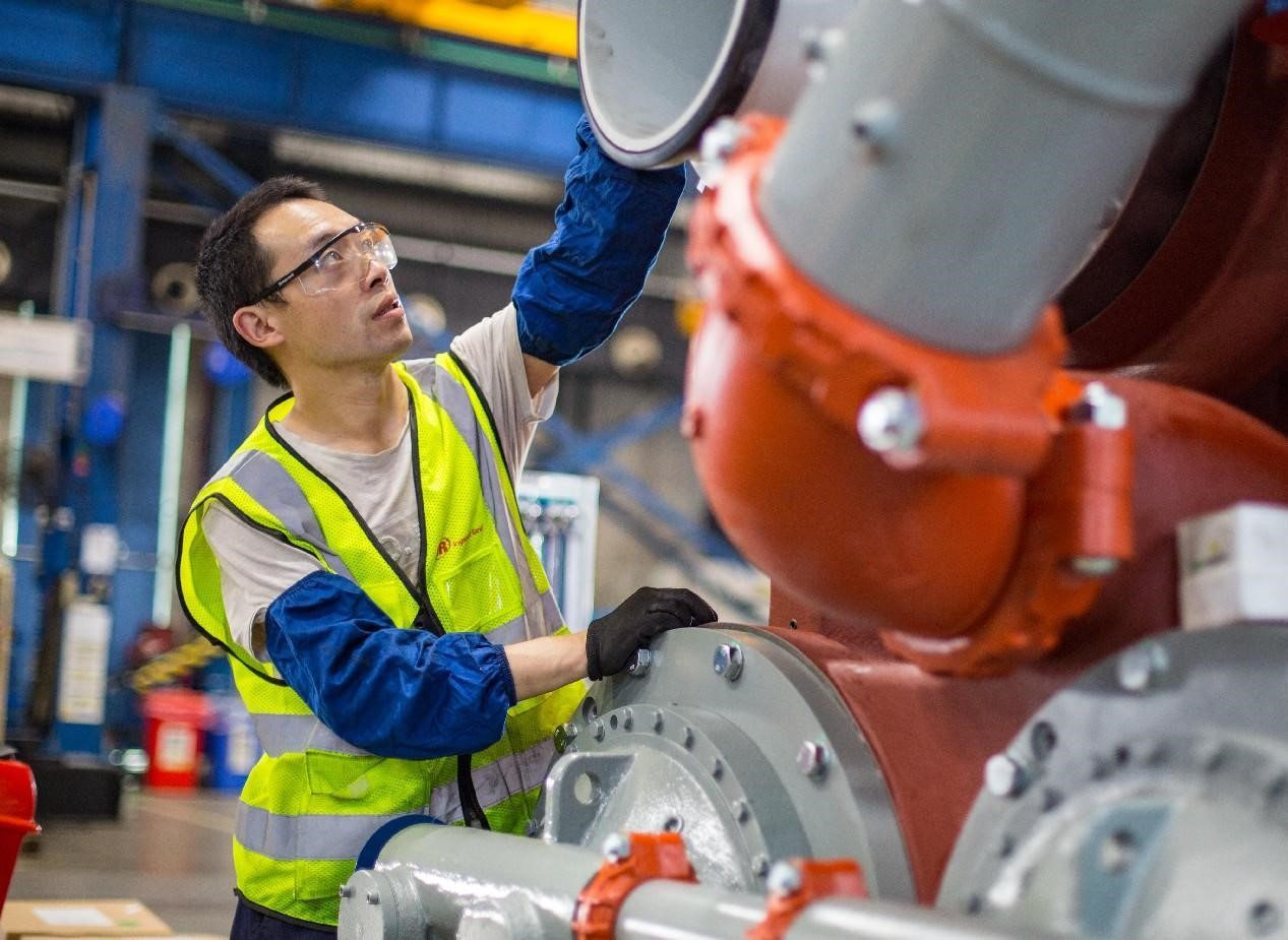 A worker is busy making air compressor products in a company in Suzhou, east China's Jiangsu province. (People's Daily Online/Zhai Huiyong)