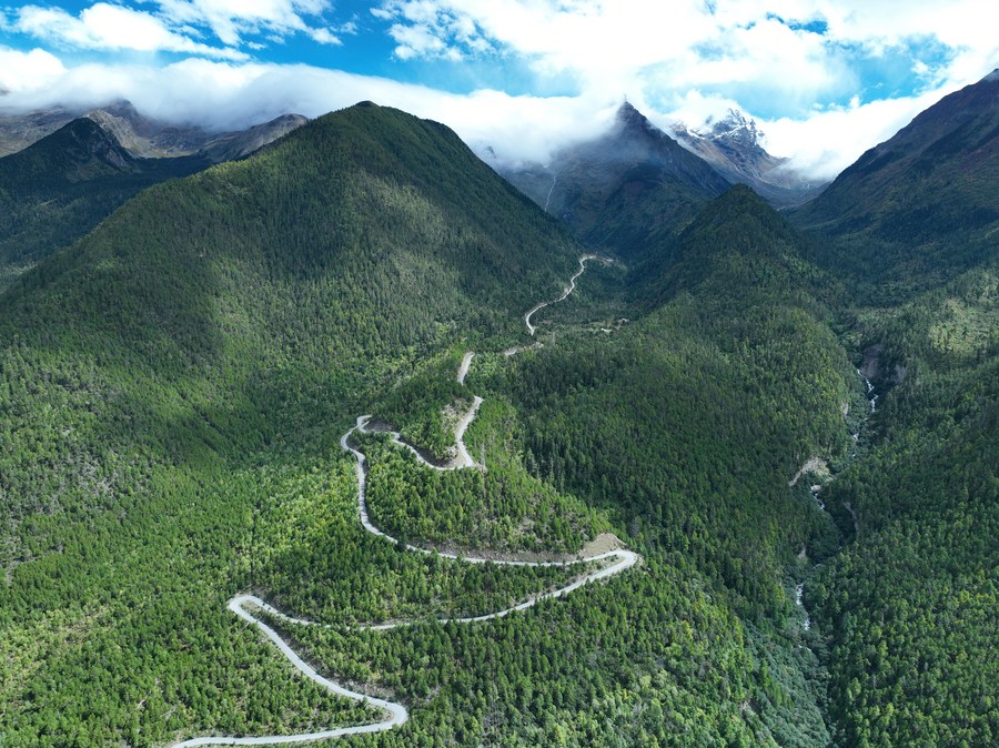 Aerial photo taken on Sept. 30, 2022 shows the highway linking Pad Township in the city of Nyingchi and Medog County, southwest China's Tibet Autonomous Region. (Photo by Dong Zhixiong/Xinhua)