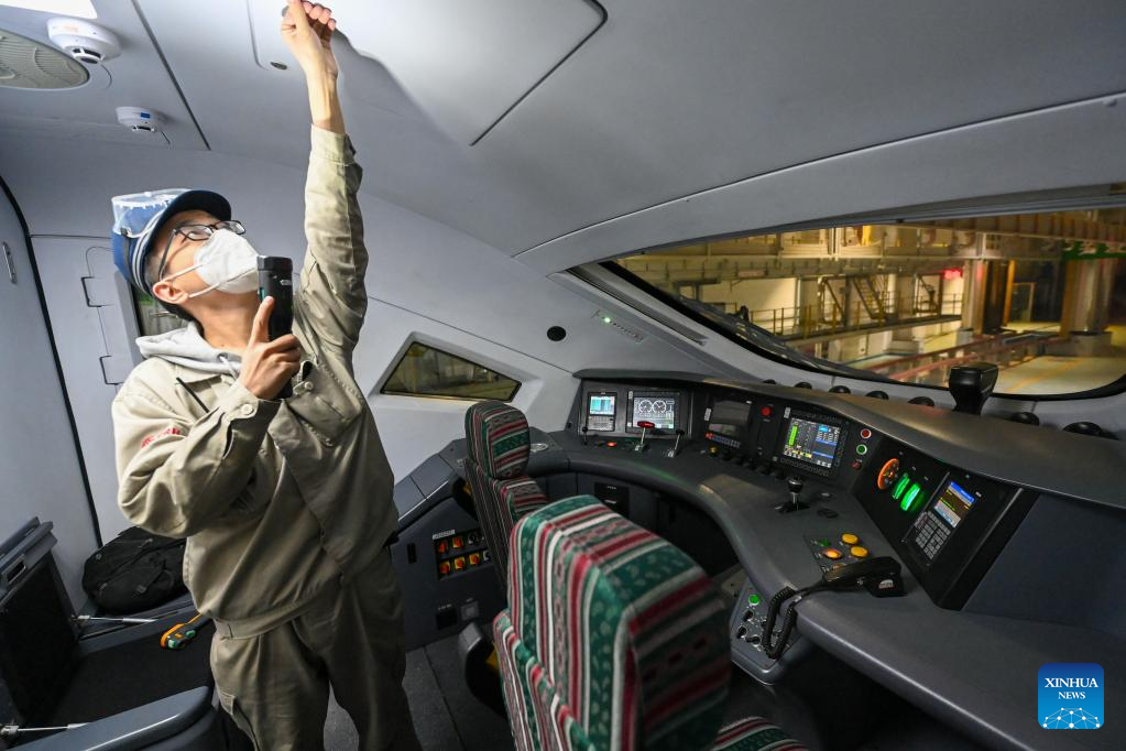 A technician inspects the cab of a bullet train at a maintenance center in Urumqi, northwest China's Xinjiang Uygur Autonomous Region, Jan. 14, 2023. Technicians at a high-speed train maintenance center in Urumqi have been busy carrying out maintenance work for trains during the Spring Festival travel rush. The Spring Festival travel rush, also known as "chunyun," began on Jan. 7 and will last until Feb. 15 this year, during which many Chinese people will travel to reunite with their families for the Chinese Lunar New Year, which falls on Jan. 22 this year. (Xinhua/Ding Lei)
