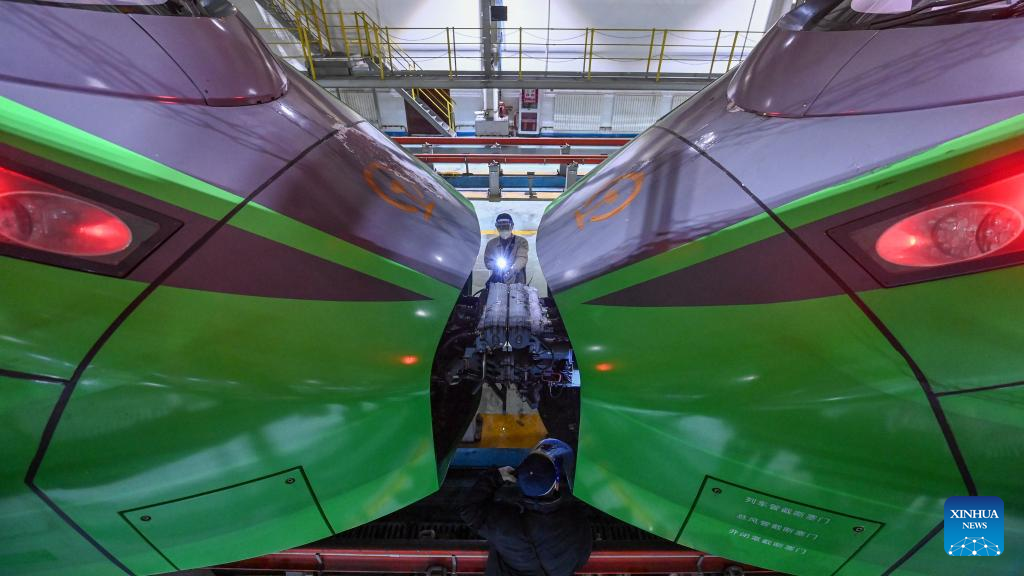 A technician inspects a bullet train's coupling at a maintenance center in Urumqi, northwest China's Xinjiang Uygur Autonomous Region, Jan. 14, 2023. Technicians at a high-speed train maintenance center in Urumqi have been busy carrying out maintenance work for trains during the Spring Festival travel rush. The Spring Festival travel rush, also known as "chunyun," began on Jan. 7 and will last until Feb. 15 this year, during which many Chinese people will travel to reunite with their families for the Chinese Lunar New Year, which falls on Jan. 22 this year. (Xinhua/Ding Lei)
