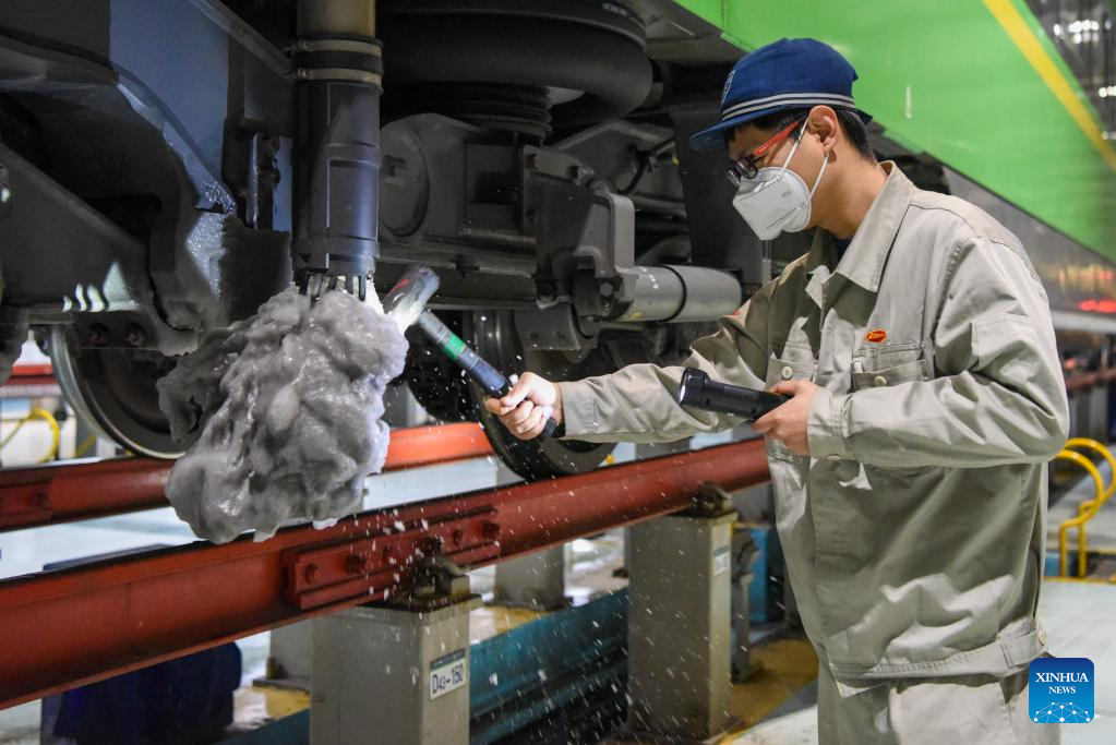 Technicians carry out maintenance work for trains during Spring Festival travel rush in Urumqi, NW China (4)