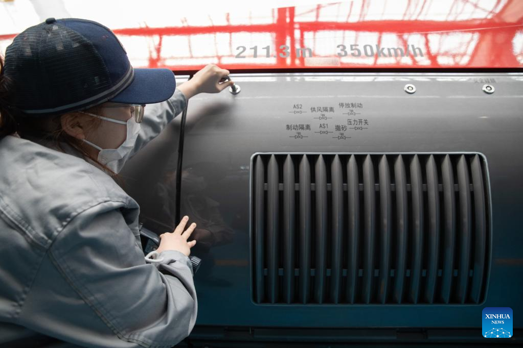 A staff member checks on the Fuxing Electric Multiple Unit (EMU) CR400BF-GZ at a maintenance station of China Railway Harbin Bureau Group Co., Ltd. in northeast China's Heilongjiang Province, Jan. 16, 2023. The most frost-resistant and most intelligent member of China's Fuxing bullet train family, the Fuxing EMU CR400BF-GZ, settled on Monday in northeast China's Heilongjiang Province. This is the region of the highest latitude and the lowest temperature that the EMU, with an operating speed of 350 km per hour, has ever reached by far. (Xinhua/Zhang Tao)