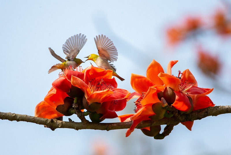 Birds frolic on a flowering kapok tree in Changjiang Li autonomous county, south China's Hainan Province. (Photo courtesy of the publicity department of the CPC Changjiang County Committee)