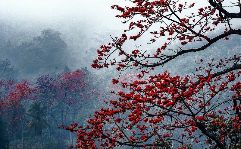 Photo shows fiery kapok flowers shrouded in clouds and fog in Changjiang Li autonomous county, south China's Hainan Province. (Photo courtesy of the publicity department of the CPC Changjiang County Committee)