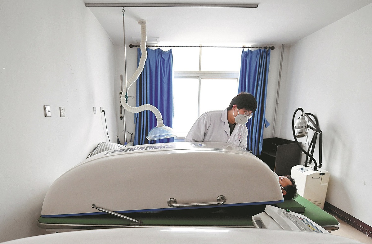 A COVID-19 patient undergoes fumigation therapy with traditional Chinese medicine at a TCM clinic in Tangshan, Hebei province, on Sunday. The clinic has been combining TCM and modern Western treatments to speed up the patient's recovery. MU YU/XINHUA