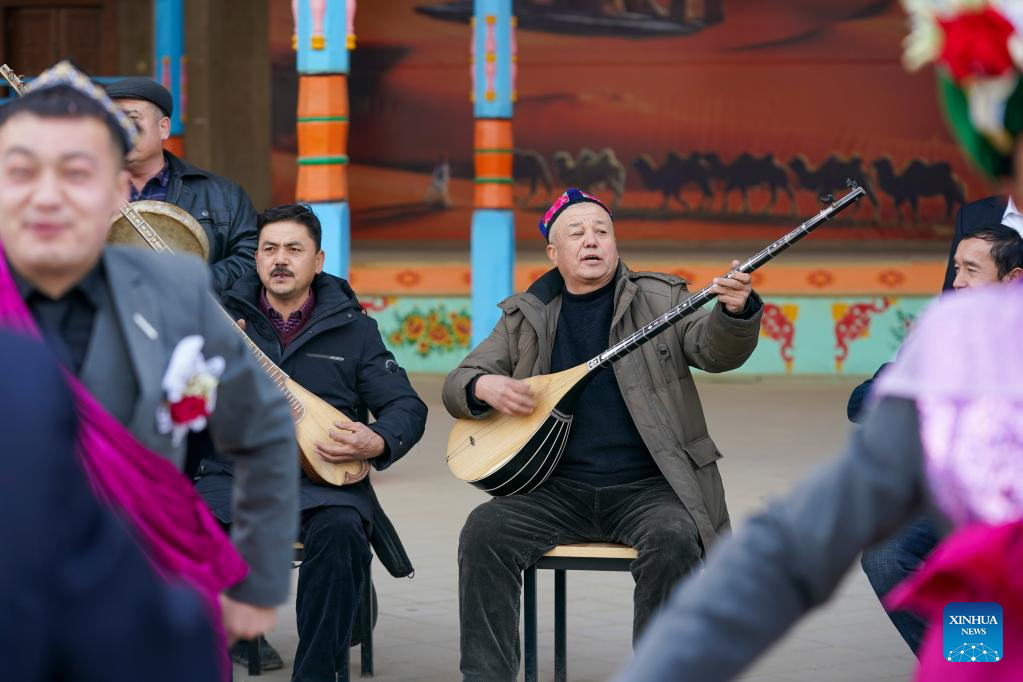 Sulayman Abdu (2nd R) and other folk artists perform at the Muqam heritage center in Lukqun Town, Shanshan County, northwest China's Xinjiang Uygur Autonomous Region, Jan. 11, 2023. With all grape vines buried properly for their protection against cold in winter, people of Lukqun Town in Shanshan have concluded their farm work of the year and started to enjoy a leisure time. However, Sulayman Abdu, a resident of Muqam Village in Lukqun, still has his hands full with performance appointments from his neighbors. Sulayman Abdu, 61, has been studying and practicing Muqam since he was 16, and now has become an inheritor of this popular folk art. Muqam, a traditional art of the Uygur ethnic group in Xinjiang, combines songs, dances, folk and classical music. According to Sulayman Abdu, it has been an age-long custom for local people to watch Muqam performance on occasions of celebration and gathering. (Xinhua/Zhao Ge)