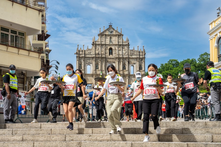 Participants take part in a tray race marking the World Tourism Day in Macao, south China, Sept. 27, 2022. (Xinhua/Cheong Kam Ka)