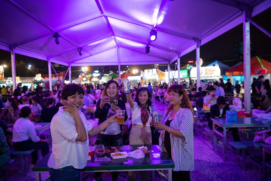 Visitors enjoy food during the 22nd Macao Food Festival at Sai Van Lake Square in Macao, south China, Nov. 18, 2022. (Xinhua/Cheong Kam Ka)