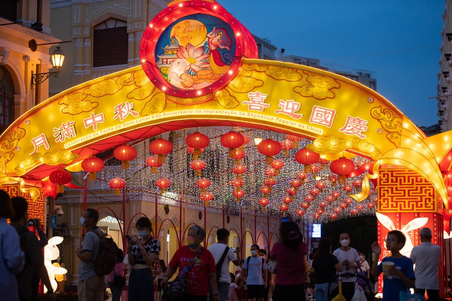 People view illumination installations during the Mid-Autumn Festival at Senado Square in south China's Macao, Sept. 10, 2022. (Xinhua/Cheong Kam Ka)