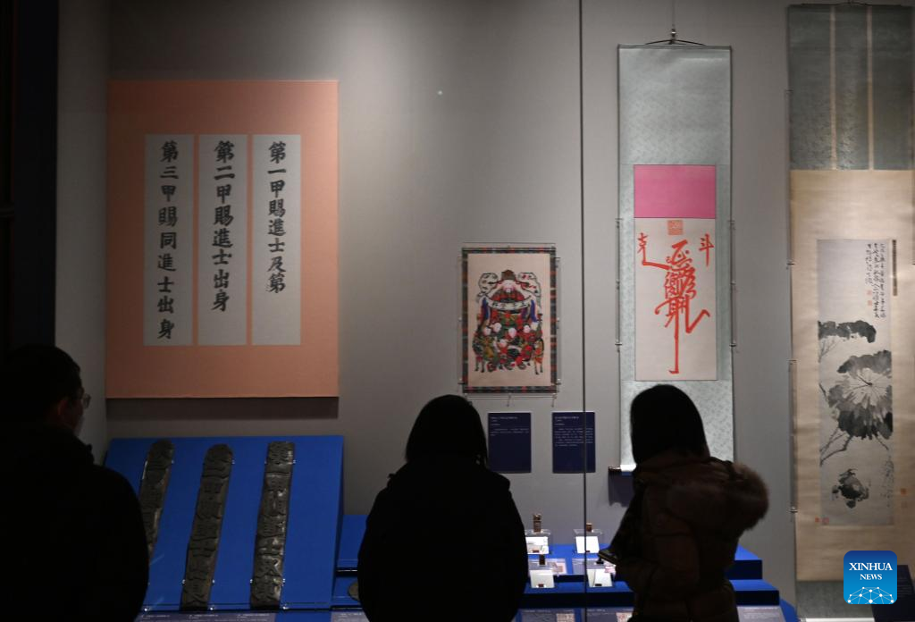 Visitors watch an exhibition at the Palace Museum in Beijing, capital of China, Jan. 16, 2023. A Joint Exhibition on Jinshi Culture and Arts Through the Ages, featuring Chinese ancient imperial scholars, kicked off at the Wumen Exhibition Hall of the Palace Museum. Some 179 selected artworks since the Tang Dynasty (618-907) were on display. (Xinhua/Jin Liangkuai)