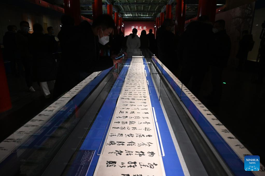 Visitors watch a piece of calligraphy work at the Palace Museum in Beijing, capital of China, Jan. 16, 2023. A Joint Exhibition on Jinshi Culture and Arts Through the Ages, featuring Chinese ancient imperial scholars, kicked off at the Wumen Exhibition Hall of the Palace Museum. Some 179 selected artworks since the Tang Dynasty (618-907) were on display. (Xinhua/Jin Liangkuai)