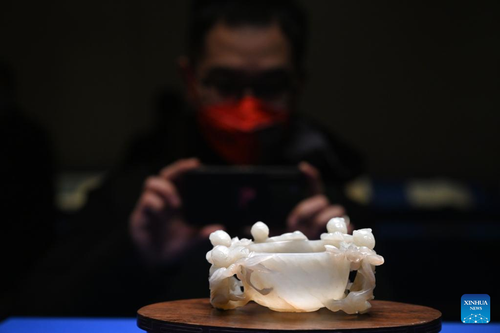 A visitor takes photo of a jade carving artwork at the Palace Museum in Beijing, capital of China, Jan. 16, 2023. A Joint Exhibition on Jinshi Culture and Arts Through the Ages, featuring Chinese ancient imperial scholars, kicked off at the Wumen Exhibition Hall of the Palace Museum. Some 179 selected artworks since the Tang Dynasty (618-907) were on display. (Xinhua/Jin Liangkuai)