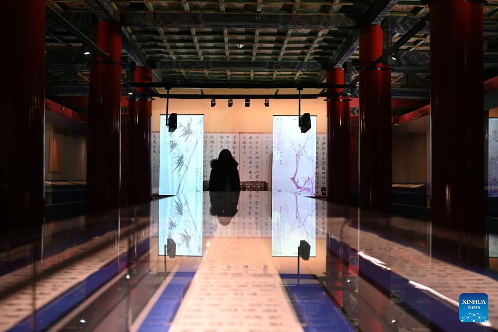 A visitor looks at artworks displayed at an exhibition at the Palace Museum in Beijing, capital of China, Jan. 16, 2023. A Joint Exhibition on Jinshi Culture and Arts Through the Ages, featuring Chinese ancient imperial scholars, kicked off at the Wumen Exhibition Hall of the Palace Museum. Some 179 selected artworks since the Tang Dynasty (618-907) were on display. (Xinhua/Jin Liangkuai)