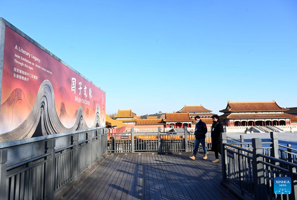 Two citizens walk past a poster of the Joint Exhibition on Jinshi Culture and Arts Through the Ages at the Palace Museum in Beijing, capital of China, Jan. 16, 2023. A Joint Exhibition on Jinshi Culture and Arts Through the Ages, featuring Chinese ancient imperial scholars, kicked off at the Wumen Exhibition Hall of the Palace Museum. Some 179 selected artworks since the Tang Dynasty (618-907) were on display. (Xinhua/Jin Liangkuai)