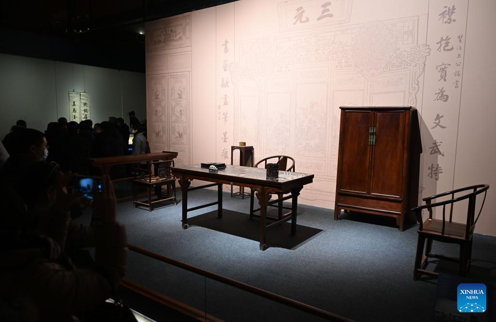 Visitors watch the replica of an ancient study at the Palace Museum in Beijing, capital of China, Jan. 16, 2023. A Joint Exhibition on Jinshi Culture and Arts Through the Ages, featuring Chinese ancient imperial scholars, kicked off at the Wumen Exhibition Hall of the Palace Museum. Some 179 selected artworks since the Tang Dynasty (618-907) were on display. (Xinhua/Jin Liangkuai)
