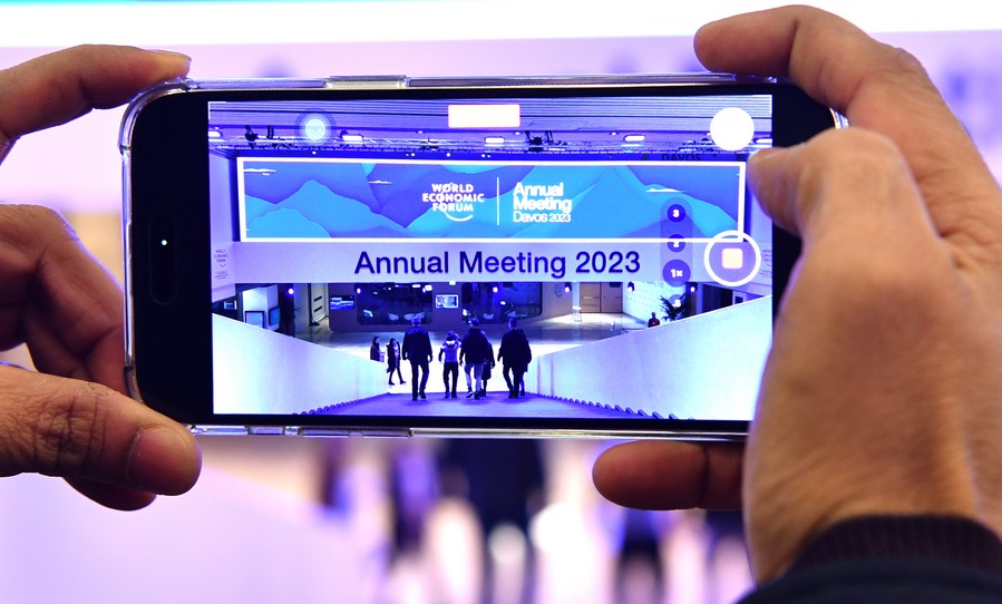 A participant takes a photo of people visiting the Congress Center for the World Economic Forum (WEF) Annual Meeting 2023 in Davos, Switzerland, Jan. 15, 2023. (Xinhua/Lian Yi)