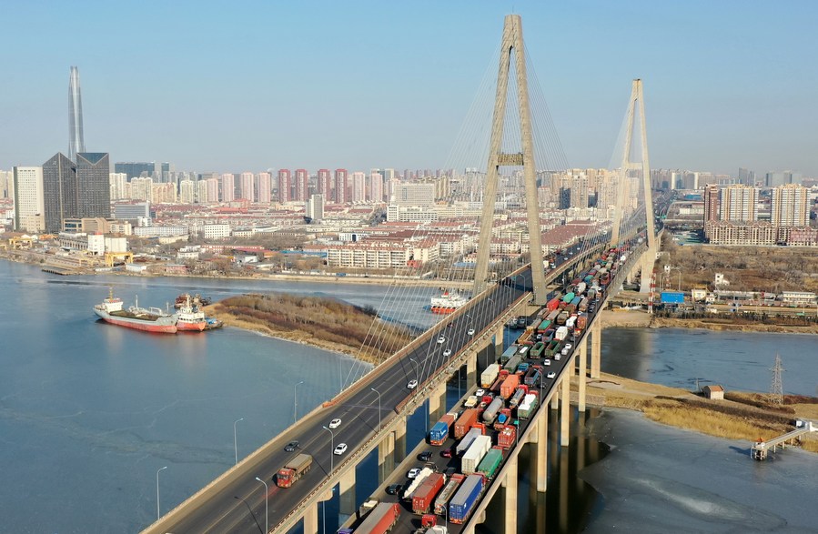 This aerial photo taken on Jan. 10, 2023 shows the Haihe River bridge, an important channel of freight transport, in Binhai New Area of North China's Tianjin. People's social and economic activities gradually return to normal after China's optimization of its COVID-19 response measures. (Xinhua/Zhao Zishuo)