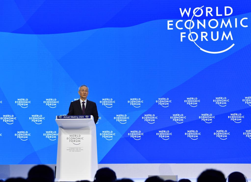 Chinese Vice Premier Liu He delivers a speech at the World Economic Forum Annual Meeting 2023 in Davos, Switzerland, on Jan. 17, 2023. (Xinhua/Lian Yi)