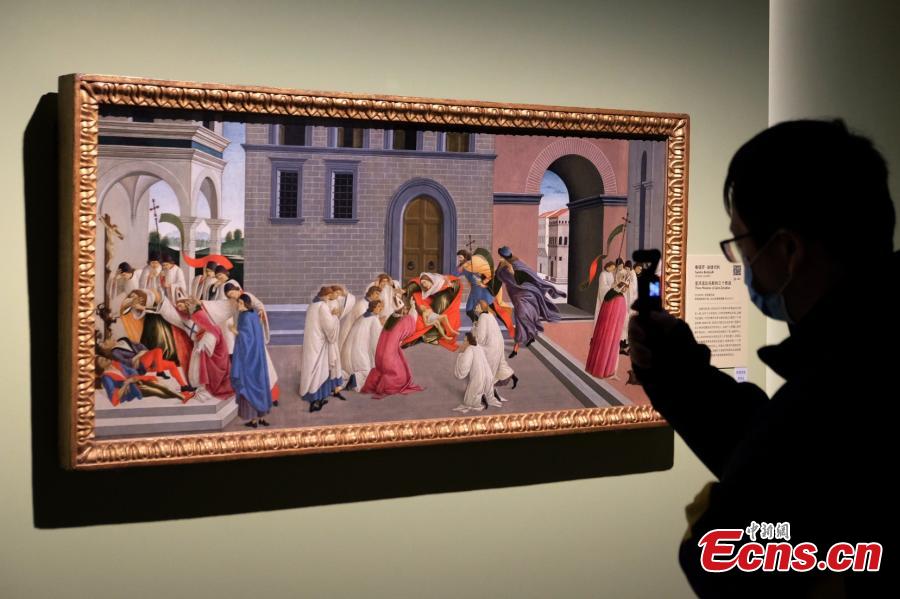 A visitor takes photos of a painting by Sandro Botticelli during the exhibition “Botticelli to Van Gogh: Masterpieces from the National Gallery”, at the Shanghai Museum, Jan. 17, 2023. (Photo: China News Service/Zhang Hengwei)