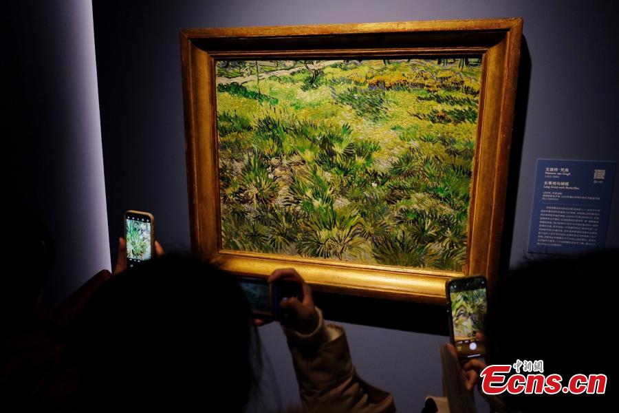 The painting "Long Grass with Butterflies" by Vincent van Gogh is on show during the exhibition “Botticelli to Van Gogh: Masterpieces from the National Gallery”, at the Shanghai Museum, Jan. 17, 2023. (Photo: China News Service/Zhang Hengwei)