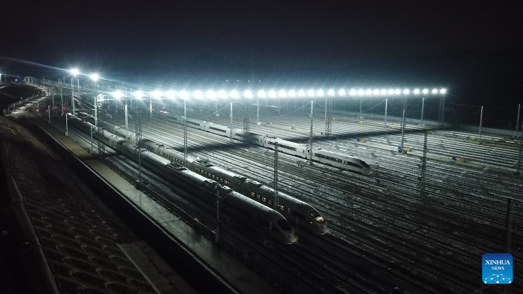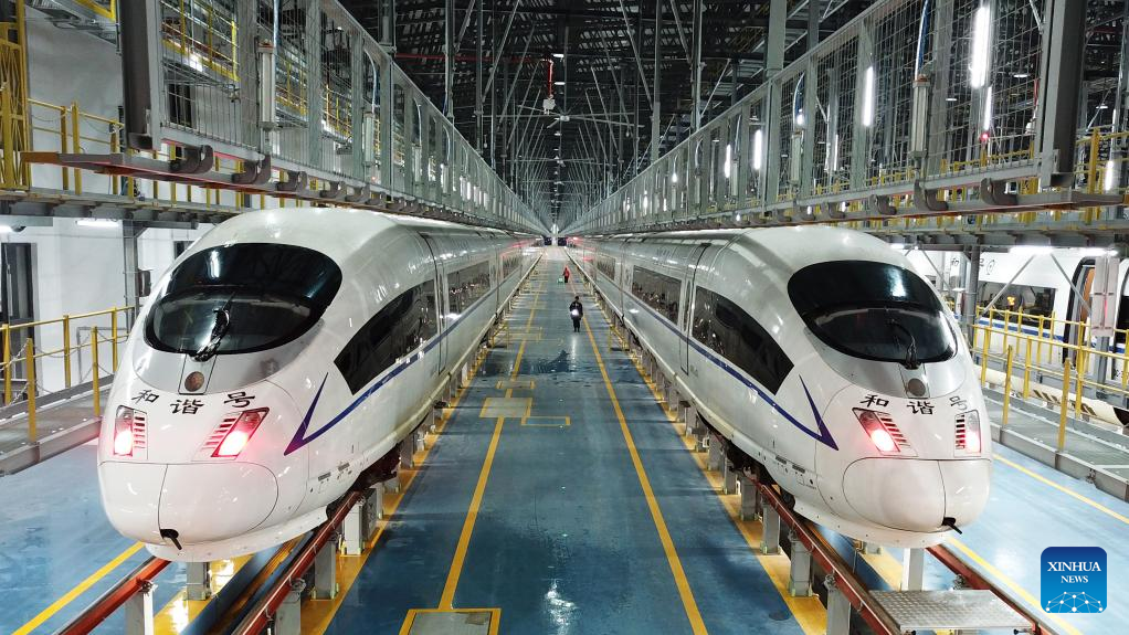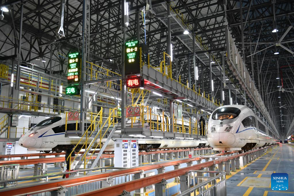 Bullet trains are parked at the Changsha West bullet train maintenance base in Changsha, central China's Hunan Province, Jan. 17, 2023. Staff members at the Changsha West bullet train maintenance base have been performing tasks during the first Spring Festival travel rush since the facility opened at the end of 2022. Using a digital and smart safety interlock monitoring system, the base has realized intelligent monitoring of bullet train operation with fewer workload and safety risks. (Xinhua/Chen Zhenhai)
