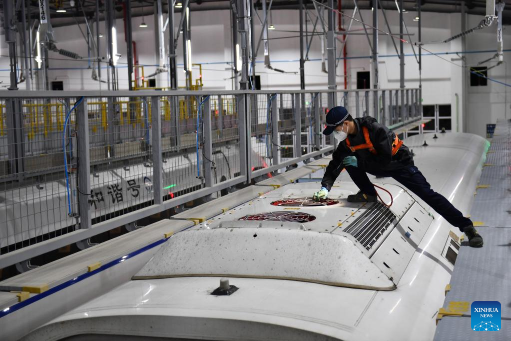 A staff member checks on a bullet train at the Changsha West bullet train maintenance base in Changsha, central China's Hunan Province, Jan. 16, 2023. Staff members at the Changsha West bullet train maintenance base have been performing tasks during the first Spring Festival travel rush since the facility opened at the end of 2022. Using a digital and smart safety interlock monitoring system, the base has realized intelligent monitoring of bullet train operation with fewer workload and safety risks. (Xinhua/Chen Zhenhai)