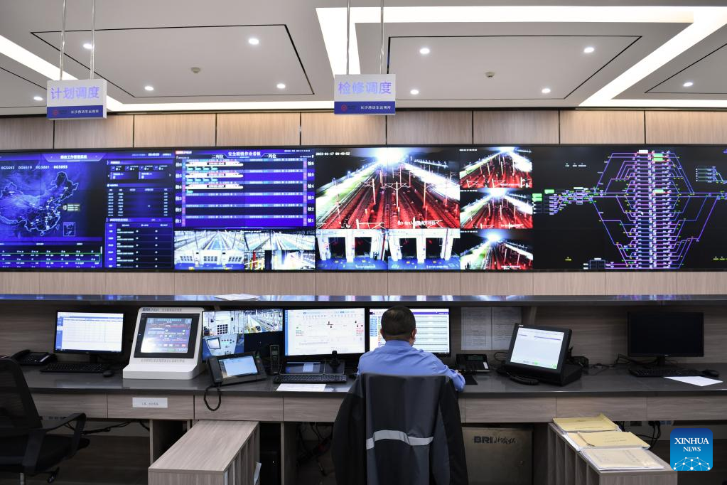 A staff member is on duty at a command center of the Changsha West bullet train maintenance base in Changsha, central China's Hunan Province, Jan. 17, 2023. Staff members at the Changsha West bullet train maintenance base have been performing tasks during the first Spring Festival travel rush since the facility opened at the end of 2022. Using a digital and smart safety interlock monitoring system, the base has realized intelligent monitoring of bullet train operation with fewer workload and safety risks. (Xinhua/Chen Zhenhai)