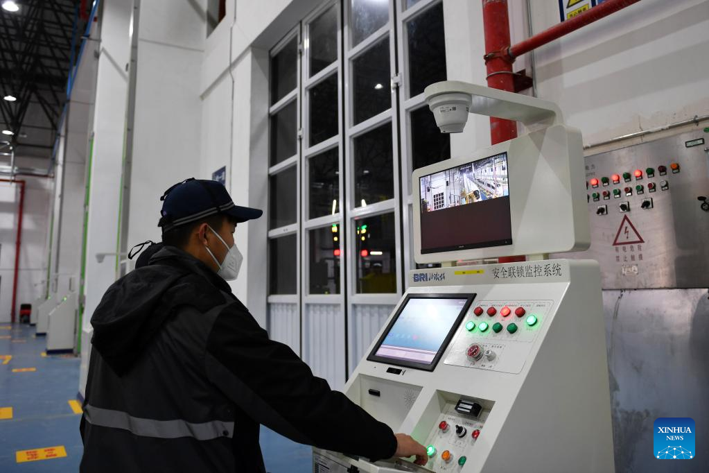 A staff member operates a safety interlock monitoring system at the Changsha West bullet train maintenance base in Changsha, central China's Hunan Province, Jan. 17, 2023. Staff members at the Changsha West bullet train maintenance base have been performing tasks during the first Spring Festival travel rush since the facility opened at the end of 2022. Using a digital and smart safety interlock monitoring system, the base has realized intelligent monitoring of bullet train operation with fewer workload and safety risks. (Xinhua/Chen Zhenhai)