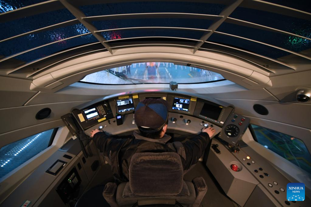 A staff member tests devices inside a bullet train cockpit at the Changsha West bullet train maintenance base in Changsha, central China's Hunan Province, Jan. 17, 2023. Staff members at the Changsha West bullet train maintenance base have been performing tasks during the first Spring Festival travel rush since the facility opened at the end of 2022. Using a digital and smart safety interlock monitoring system, the base has realized intelligent monitoring of bullet train operation with fewer workload and safety risks. (Xinhua/Chen Zhenhai)