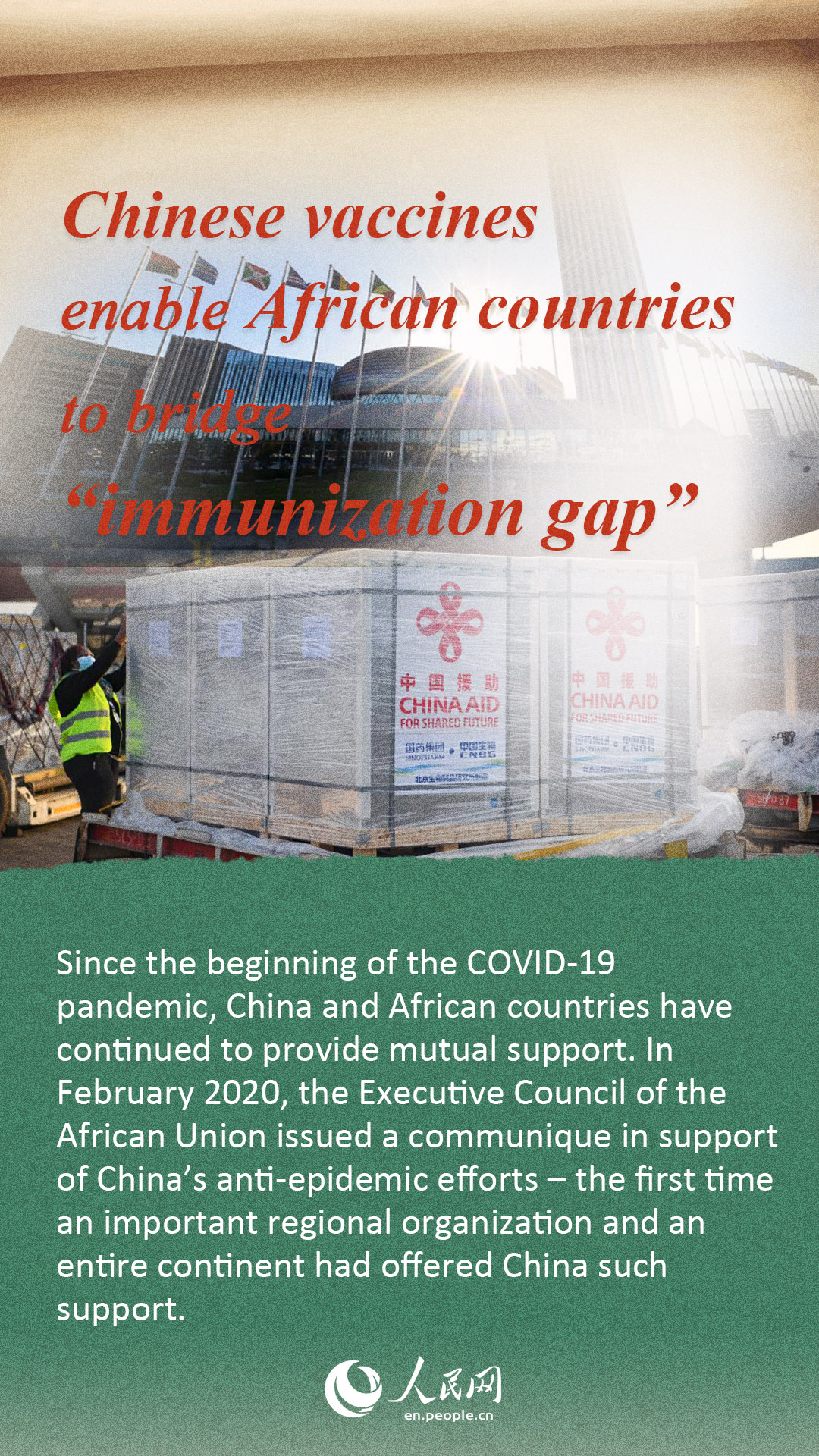 Since the beginning of the COVID-19 pandemic, China and African countries have continued to provide mutual support. In February 2020, the Executive Council of the African Union issued a communique in support of China’s anti-epidemic efforts – the first time an important regional organization and an entire continent had offered China such support.