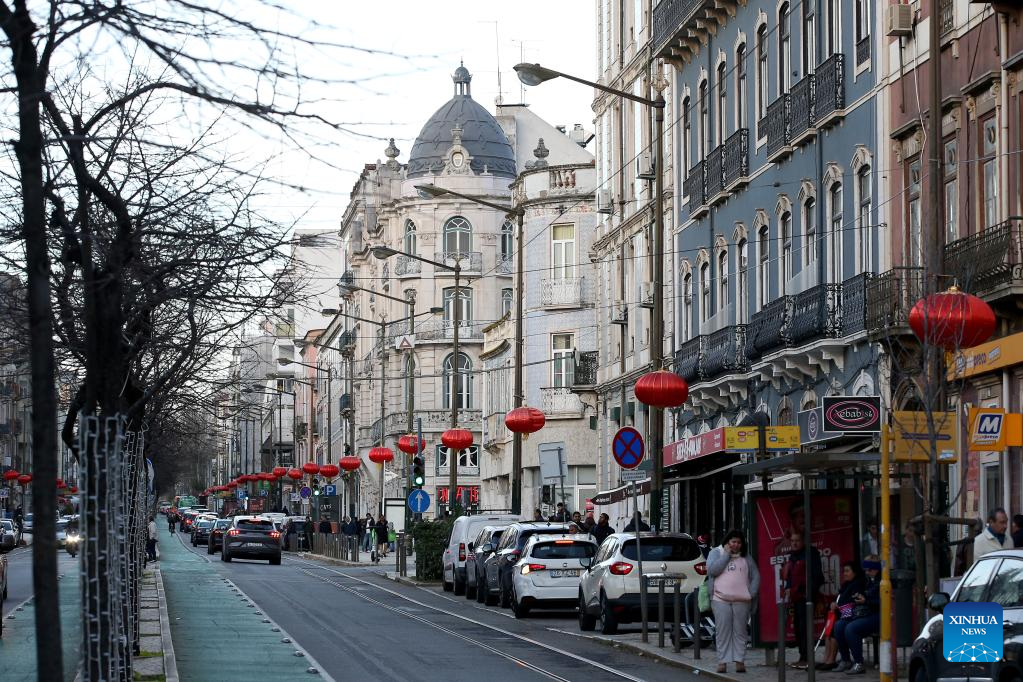 A street is decorated with red lanterns for the upcoming Chinese Lunar New Year in Lisbon, Portugal, on Jan. 16, 2023. (Photo by Pedro Fiuza/Xinhua)