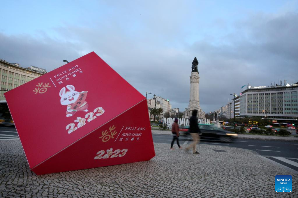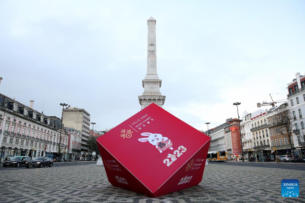 A decoration for the Chinese Lunar New Year is seen in a square in Lisbon, Portugal, on Jan. 16, 2023. (Photo by Pedro Fiuza/Xinhua)