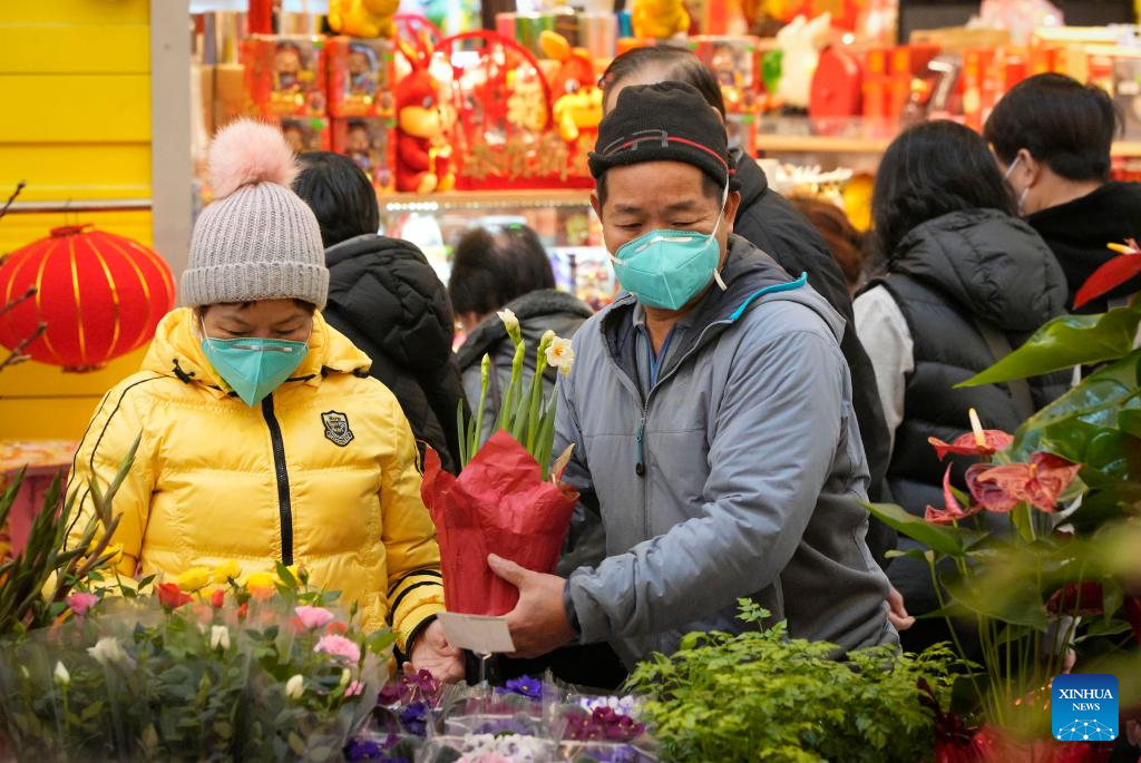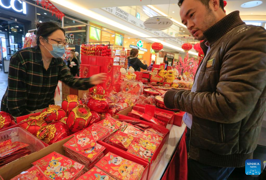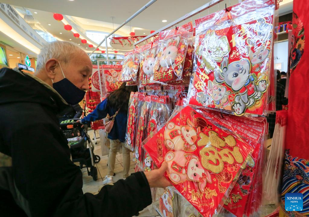 A man shops for decorations at the Chinese Lunar New Year Flower and Gift Fair in Richmond, British Columbia, Canada, on Jan. 17, 2023. (Photo by Liang Sen/Xinhua)