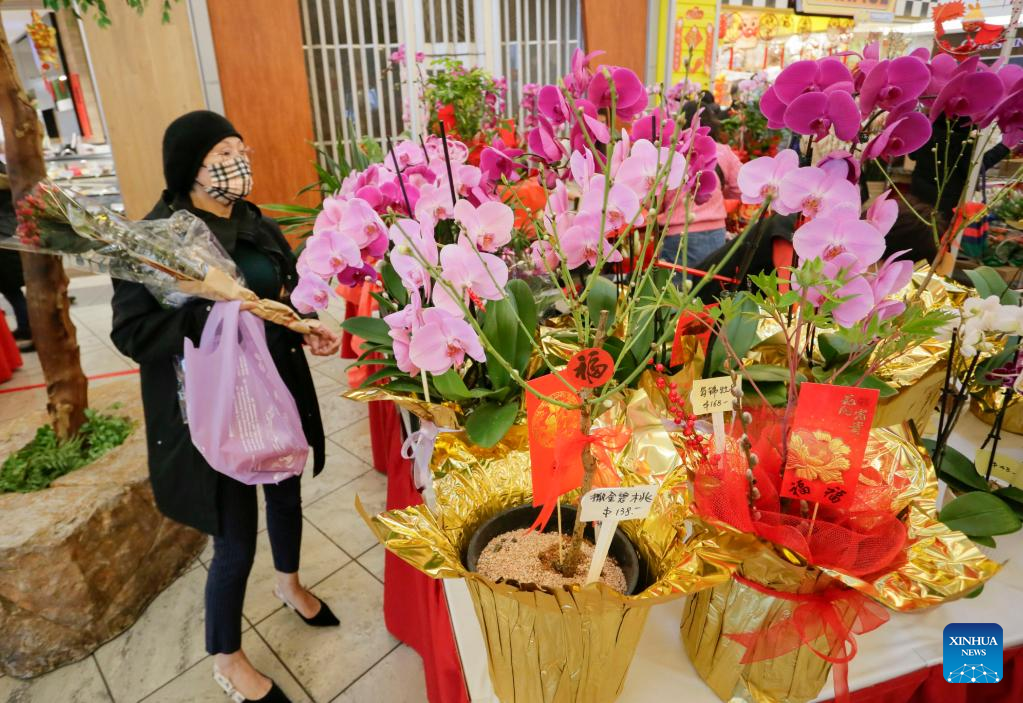 A woman shops for flowers at the Chinese Lunar New Year Flower and Gift Fair in Richmond, British Columbia, Canada, on Jan. 17, 2023. (Photo by Liang Sen/Xinhua)