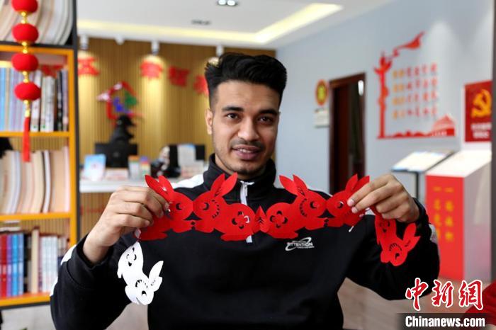 A foreigner shows his paper cutting work in Xifeng district, Qingyang city, northwest China’s Gansu Province, Jan. 15, 2023. (Photo/Pan Xiaomei)