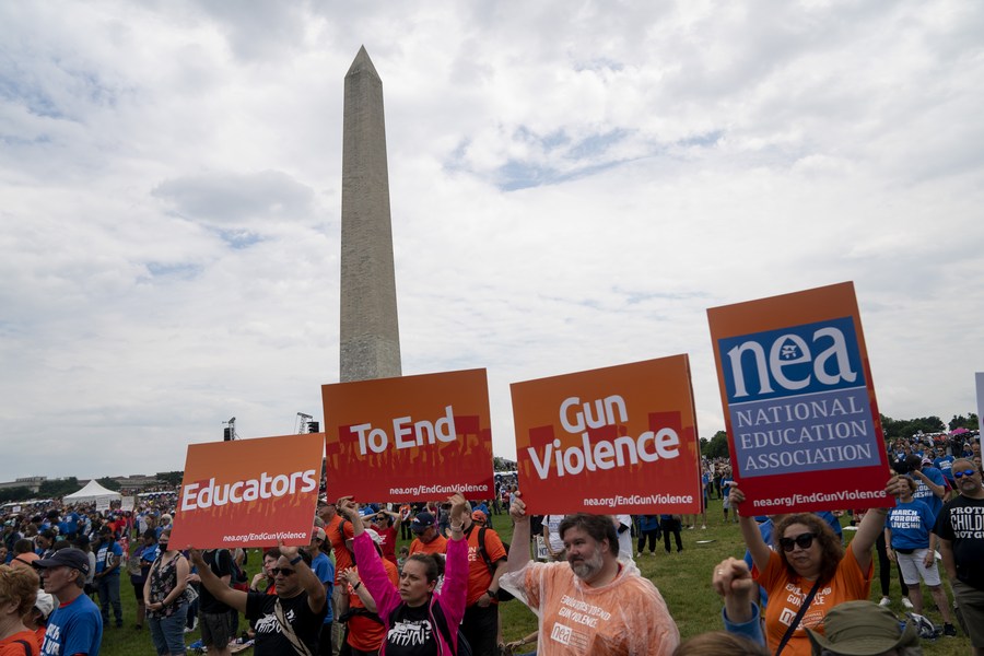 People gather during a rally decrying rising gun violence while urging politicians to take action in Washington, D.C., the United States, June 11, 2022. (Xinhua/Liu Jie)