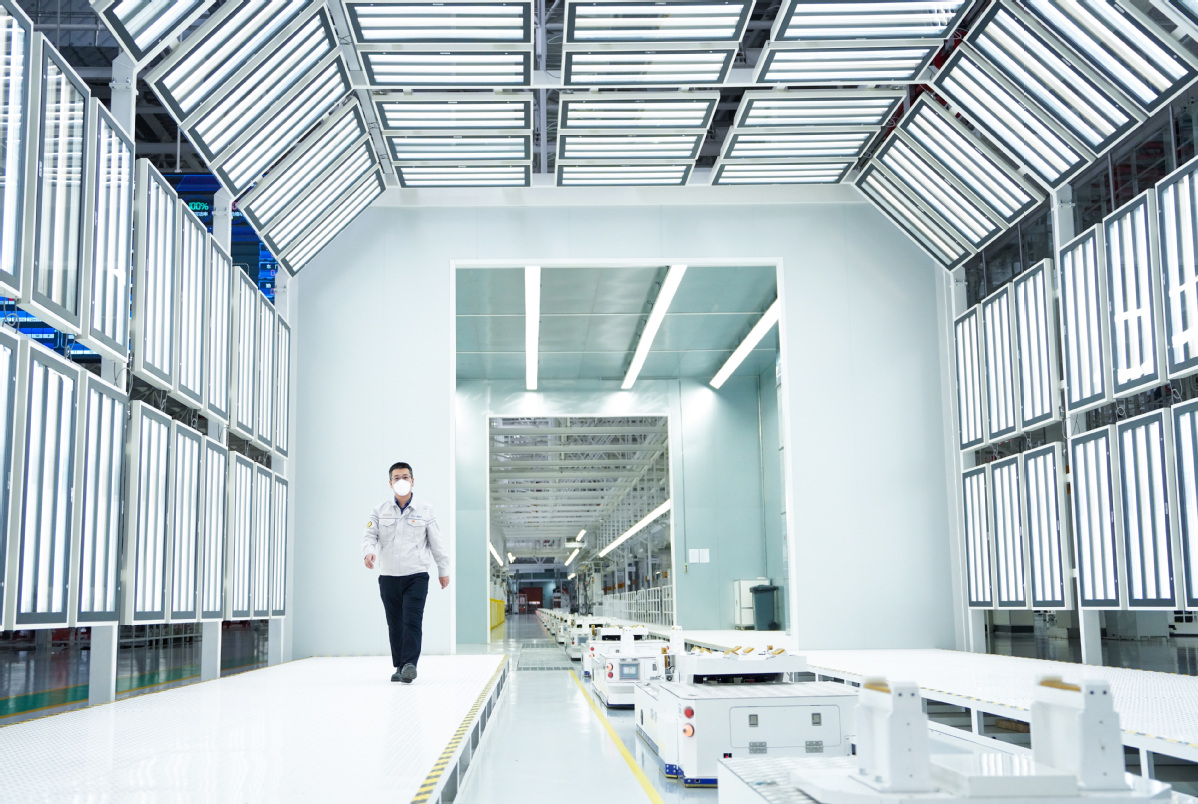Wang Yiqiang, director of an intelligent automobile manufacturing company, checks the operation condition of automated guided vehicles in Changchun, northeast China's Jilin province on Dec 27, 2022. [Photo/Xinhua]