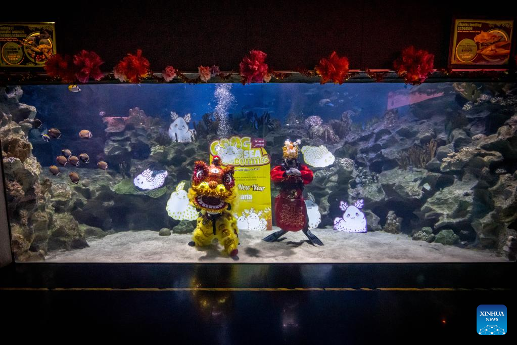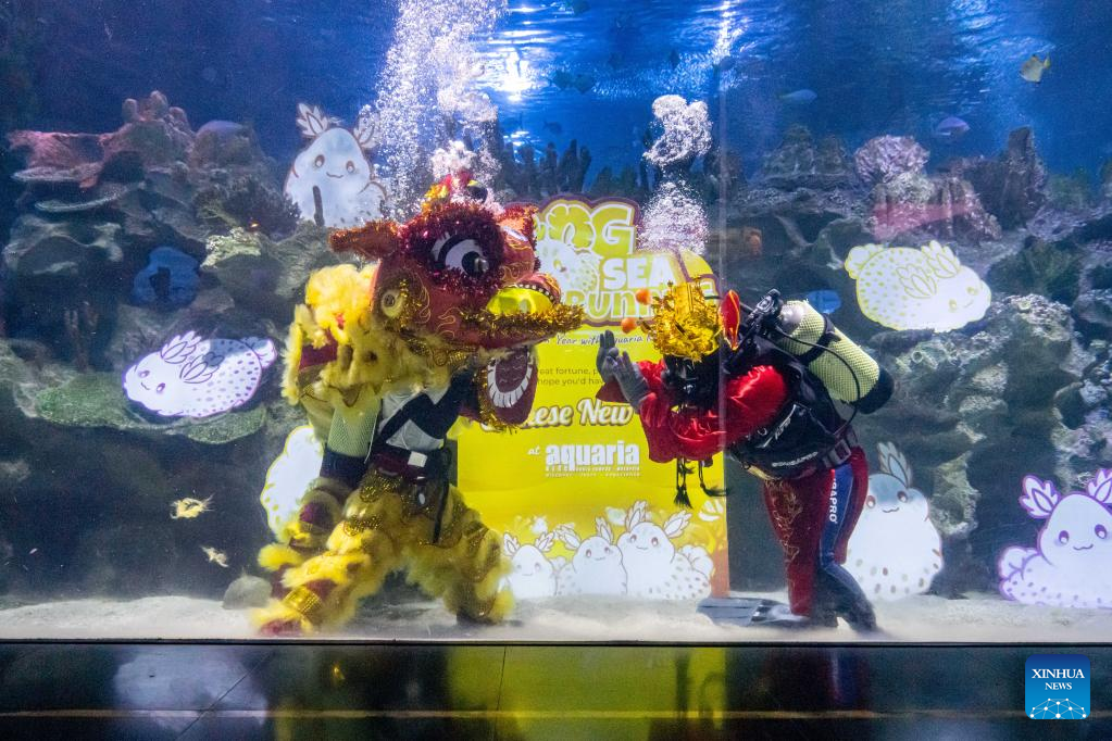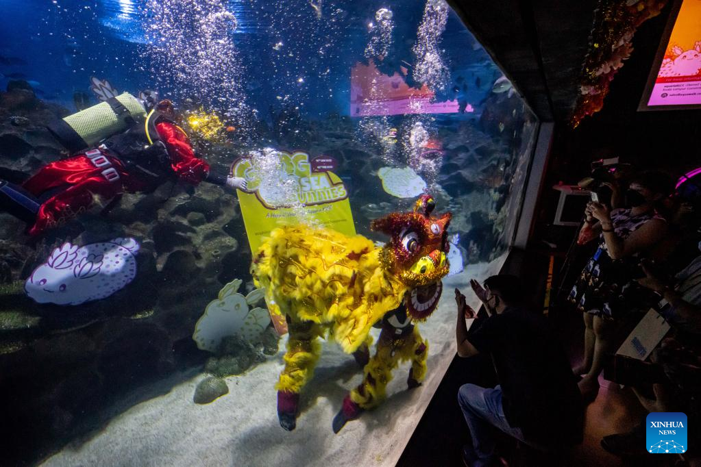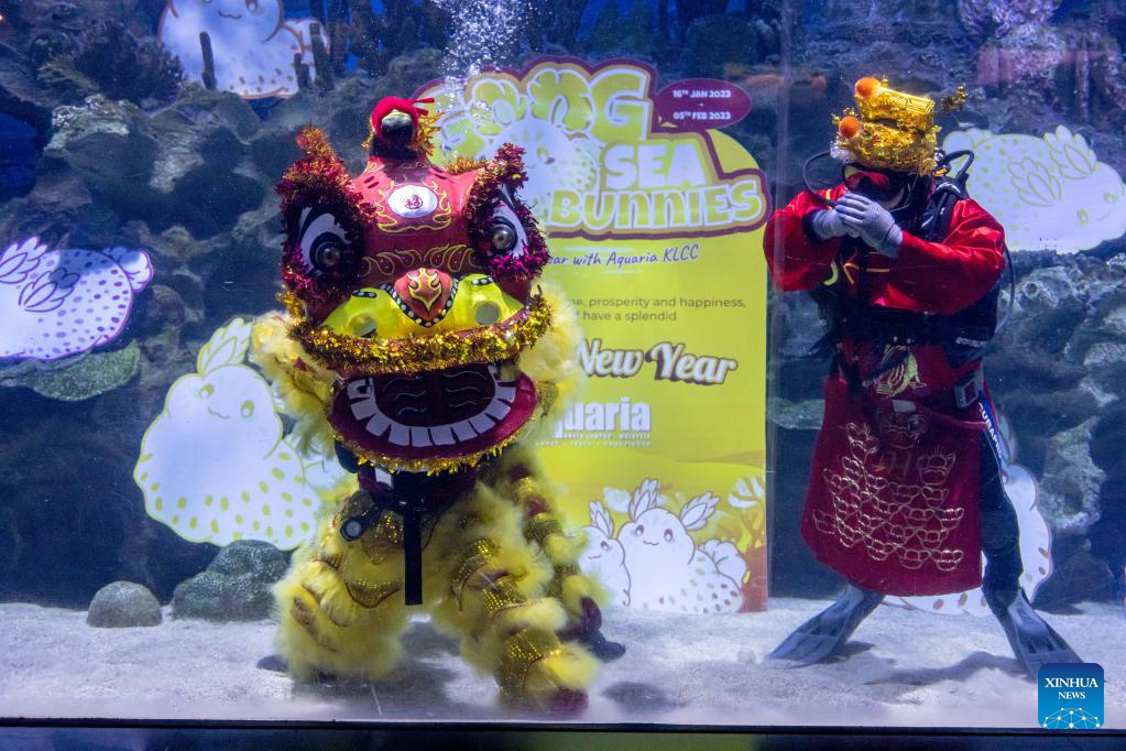Divers dressed as a lion and a Fortune God stage an underwater performance in celebration of the Lunar New Year at Aquaria KLCC in Kuala Lumpur, Malaysia, Jan. 18, 2023. (Xinhua/Zhu Wei)