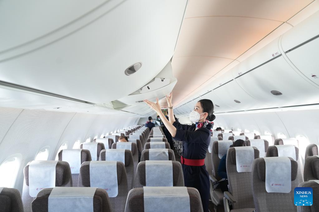 A flight attendant of China Eastern Airlines works in the cabin of a C919 large passenger aircraft, China's first homegrown large jetliner, during a validation flight from Hongqiao International Airport in east China's Shanghai to Capital International Airport in China's capital Beijing, Jan. 9, 2023. The world's first C919 aircraft began its 100-hour aircraft validation flight process on Dec. 26, 2022 after it was delivered to China Eastern Airlines on Dec. 9, 2022. The testing process will comprehensively verify the reliability of the C919 with commercial operation in mind -- with the aim of ensuring its safety and efficiency. (Xinhua/Ding Ting)