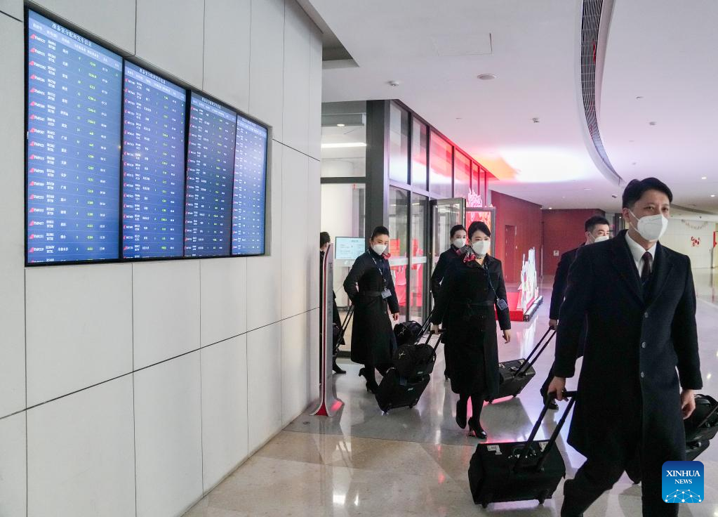 Crew members get ready to board a C919 large passenger aircraft, China's first homegrown large jetliner, before a validation flight from Hongqiao International Airport in east China's Shanghai to Capital International Airport in China's capital Beijing, Jan. 9, 2023. The world's first C919 aircraft began its 100-hour aircraft validation flight process on Dec. 26, 2022 after it was delivered to China Eastern Airlines on Dec. 9, 2022. The testing process will comprehensively verify the reliability of the C919 with commercial operation in mind -- with the aim of ensuring its safety and efficiency. (Xinhua/Ding Ting)