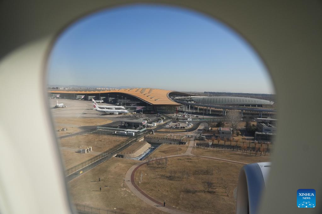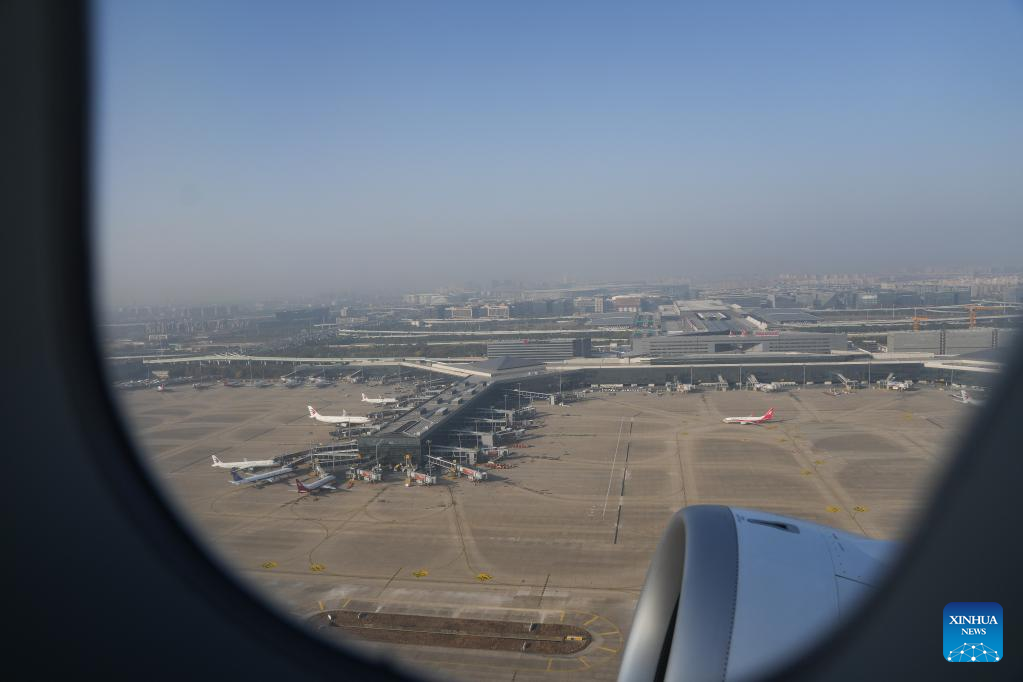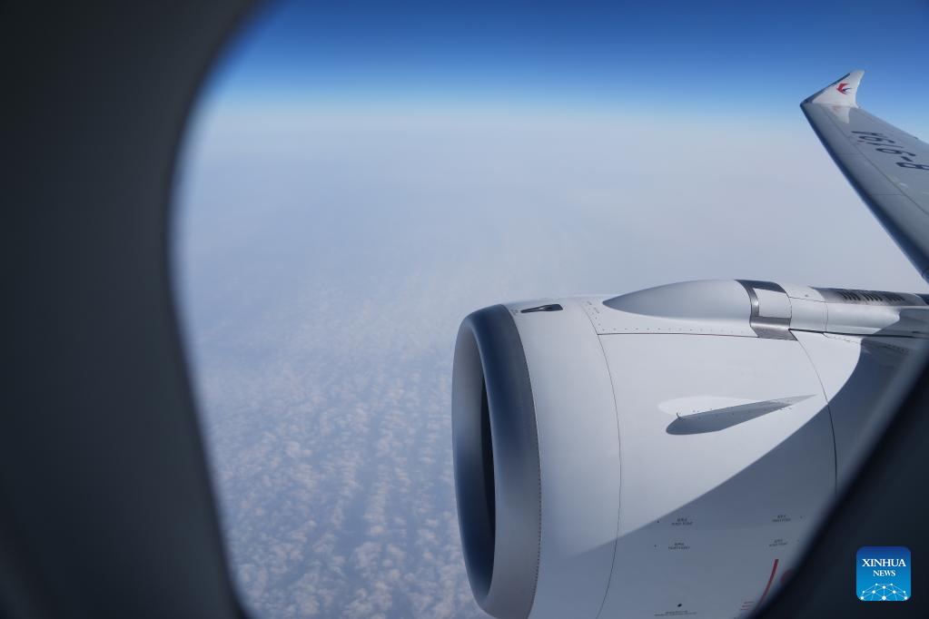 This photo shows a view seen through a cabin window aboard a C919 large passenger aircraft, China's first homegrown large jetliner, during a validation flight from Hongqiao International Airport in east China's Shanghai to Capital International Airport in China's capital Beijing, Jan. 9, 2023. The world's first C919 aircraft began its 100-hour aircraft validation flight process on Dec. 26, 2022 after it was delivered to China Eastern Airlines on Dec. 9, 2022. The testing process will comprehensively verify the reliability of the C919 with commercial operation in mind -- with the aim of ensuring its safety and efficiency. (Xinhua/Ding Ting)