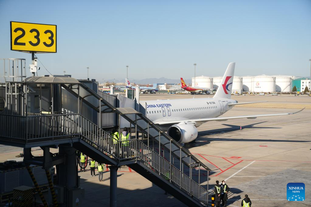 A C919 large passenger aircraft, China's first homegrown large jetliner, arrives at Capital International Airport in Beijing, capital of China, Jan. 9, 2023. The world's first C919 aircraft began its 100-hour aircraft validation flight process on Dec. 26, 2022 after it was delivered to China Eastern Airlines on Dec. 9, 2022. The testing process will comprehensively verify the reliability of the C919 with commercial operation in mind -- with the aim of ensuring its safety and efficiency. (Xinhua/Ding Ting)