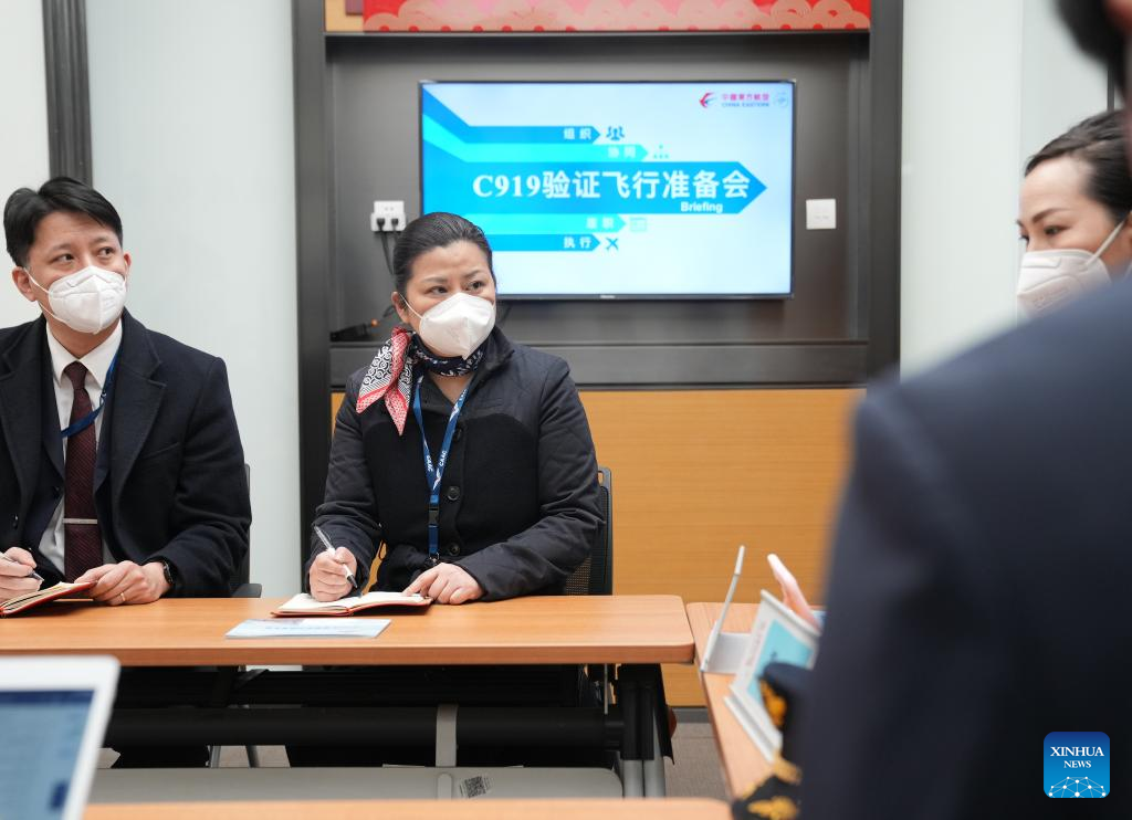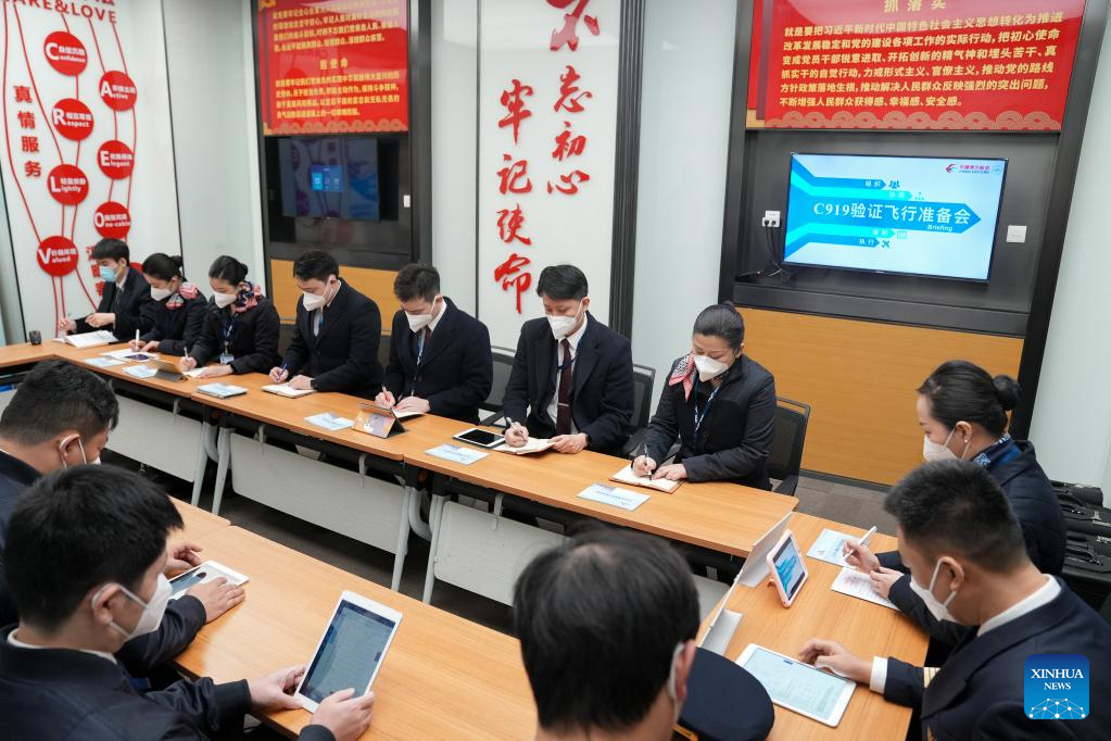 Crew members of China Eastern Airlines have a meeting before a validation flight of a C919 large passenger aircraft, China's first homegrown large jetliner, in east China's Shanghai, Jan. 9, 2023. The world's first C919 aircraft began its 100-hour aircraft validation flight process on Dec. 26, 2022 after it was delivered to China Eastern Airlines on Dec. 9, 2022. The testing process will comprehensively verify the reliability of the C919 with commercial operation in mind -- with the aim of ensuring its safety and efficiency. (Xinhua/Ding Ting)