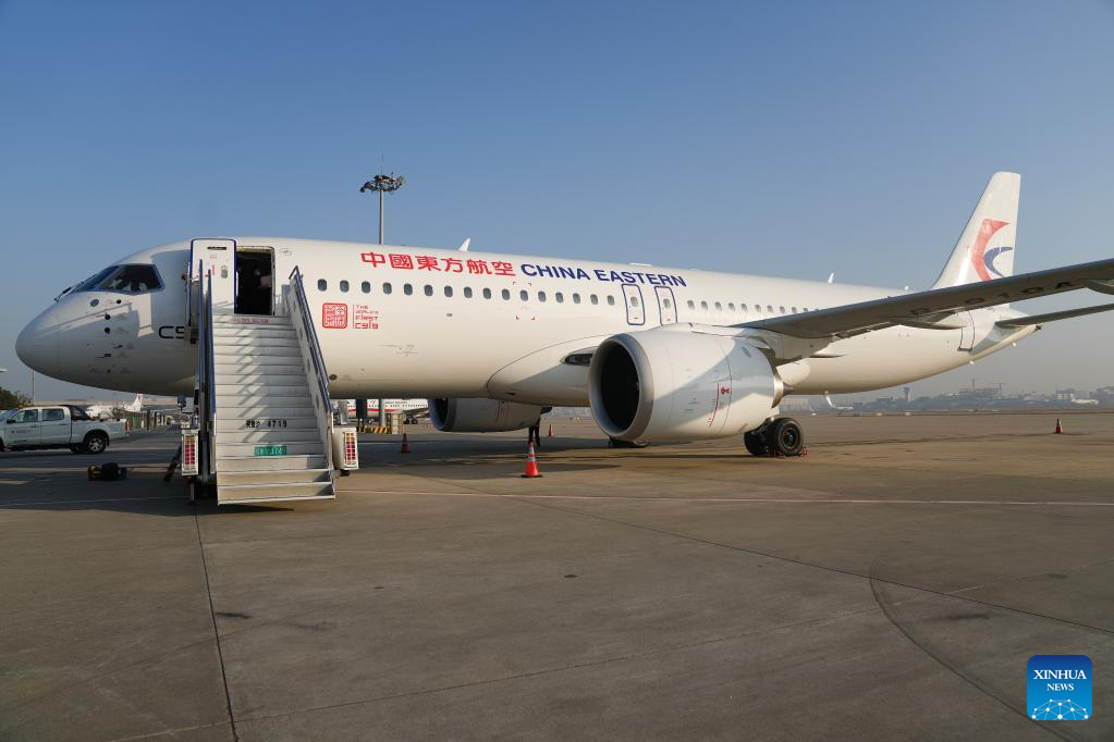 This photo taken on Jan. 9, 2023 shows a C919 large passenger aircraft, China's first homegrown large jetliner, at Hongqiao International Airport in east China's Shanghai. The world's first C919 aircraft began its 100-hour aircraft validation flight process on Dec. 26, 2022 after it was delivered to China Eastern Airlines on Dec. 9, 2022. The testing process will comprehensively verify the reliability of the C919 with commercial operation in mind -- with the aim of ensuring its safety and efficiency. (Xinhua/Ding Ting)