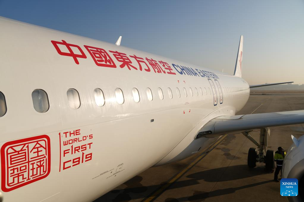 A C919 large passenger aircraft, China's first homegrown large jetliner, takes off during a validation flight from Hongqiao International Airport in east China's Shanghai to Capital International Airport in China's capital Beijing, Jan. 9, 2023. The world's first C919 aircraft began its 100-hour aircraft validation flight process on Dec. 26, 2022 after it was delivered to China Eastern Airlines on Dec. 9, 2022. The testing process will comprehensively verify the reliability of the C919 with commercial operation in mind -- with the aim of ensuring its safety and efficiency. (Xinhua/Ding Ting)
