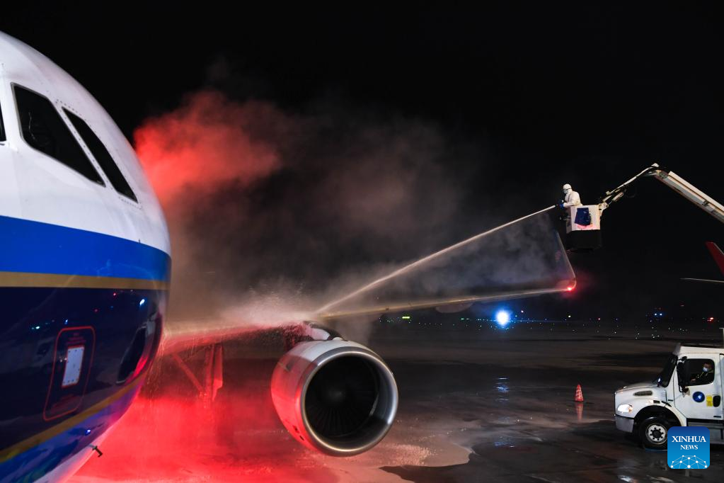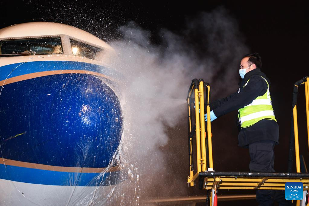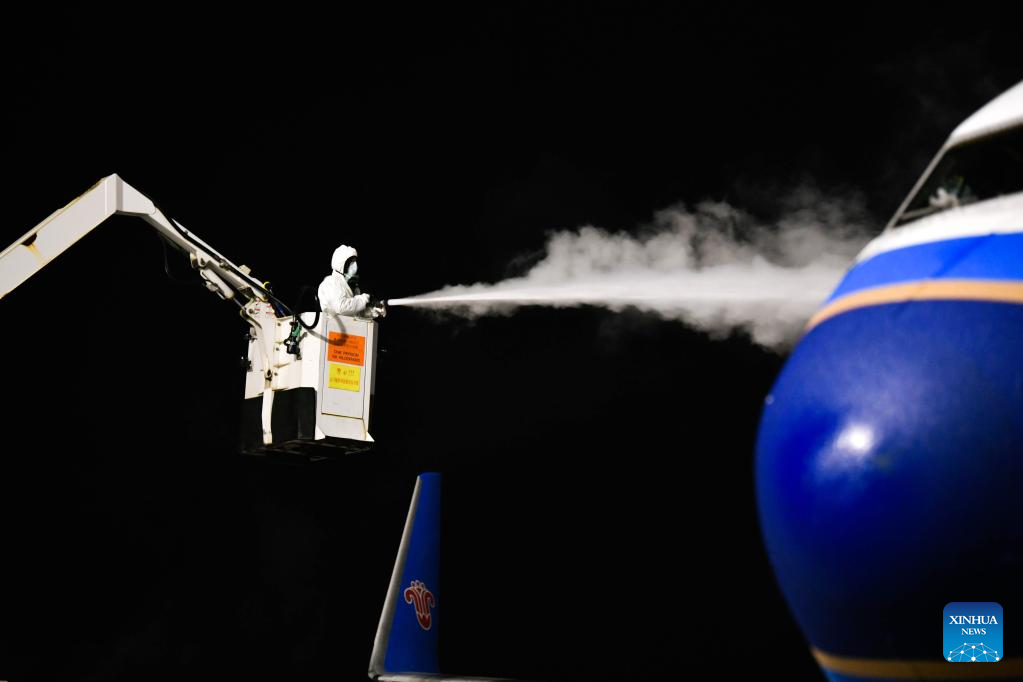A maintenance worker of China Southern Airlines performs aircraft de-icing and anti-icing at Guiyang Longdongbao International Airport in Guiyang, southwest China's Guizhou Province, Jan. 17, 2023. To ensure flight safety during the Spring Festival travel rush, aircraft maintenance workers have been working late hours to perform aircraft de-icing and anti-icing of aircrafts at Guiyang Longdongbao International Airport amid the cold weather. (Xinhua/Yang Wenbin)