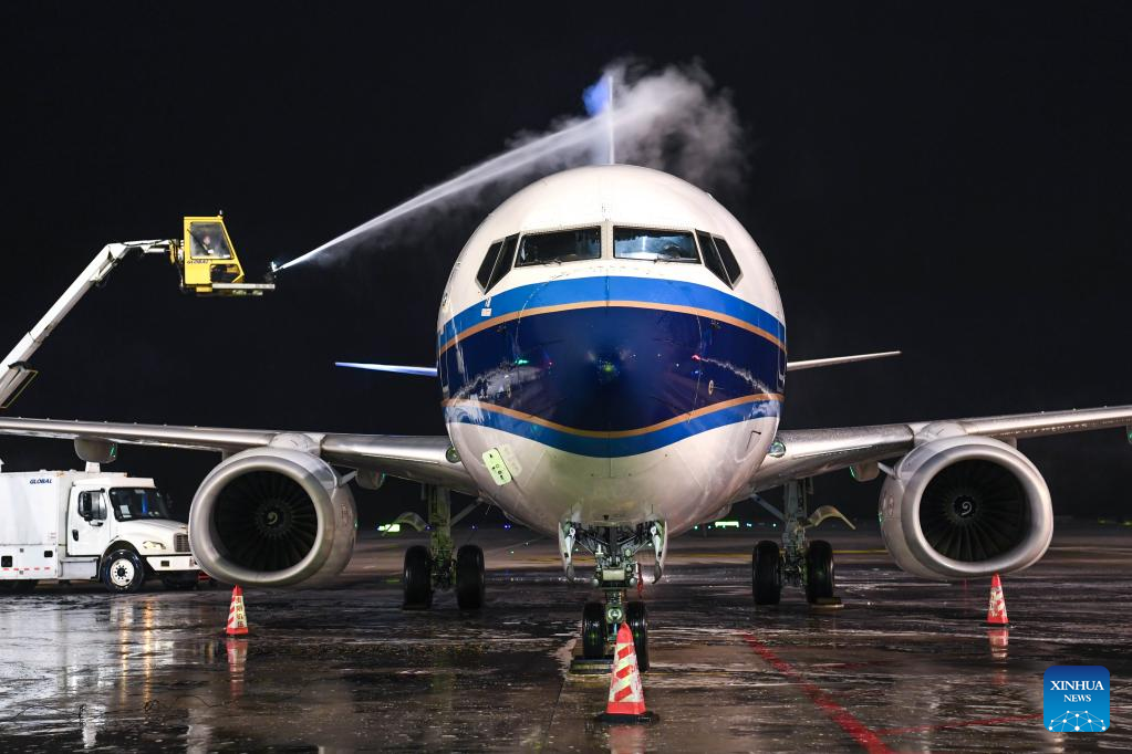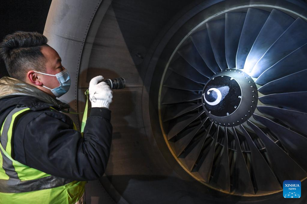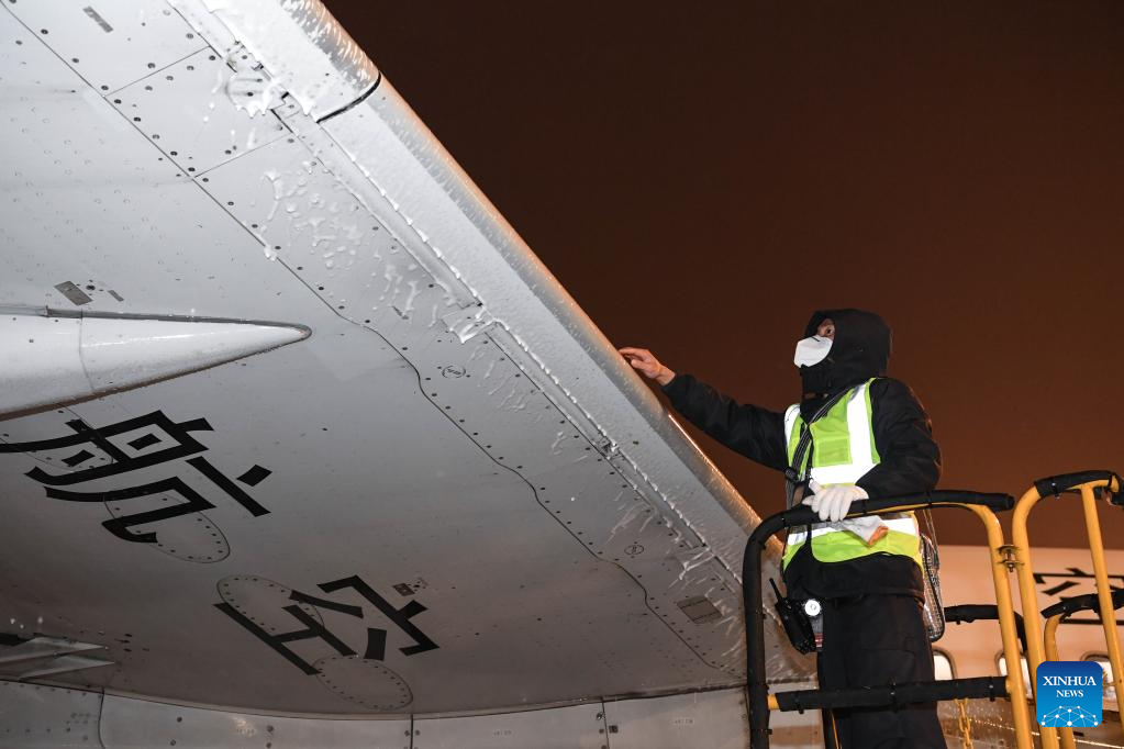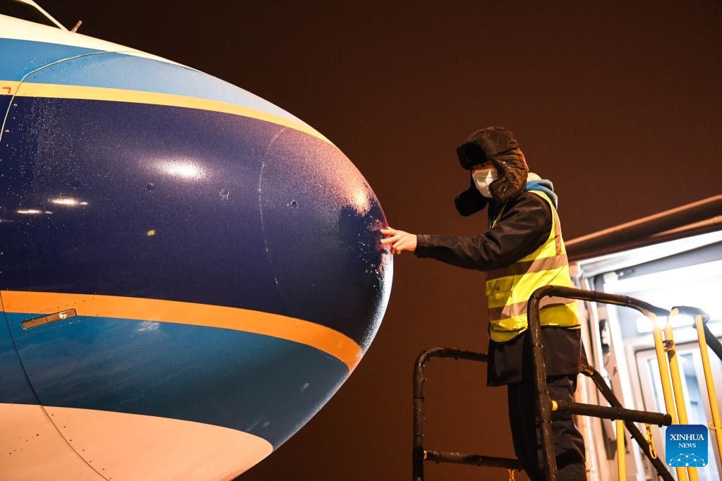 A maintenance worker of China Southern Airlines checks an aircraft engine before de-icing process at Guiyang Longdongbao International Airport in Guiyang, southwest China's Guizhou Province, Jan. 17, 2023. To ensure flight safety during the Spring Festival travel rush, aircraft maintenance workers have been working late hours to perform aircraft de-icing and anti-icing of aircrafts at Guiyang Longdongbao International Airport amid the cold weather. (Xinhua/Yang Wenbin)